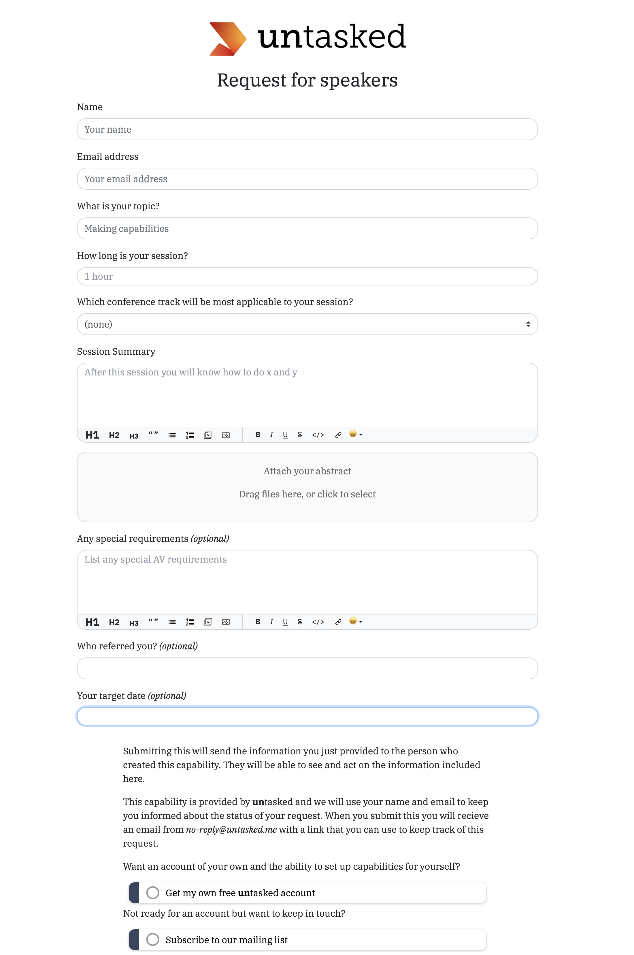 This means that you can accept external requests for work and gather the same kind of context information from a customer, partner, new lead, or anyone, and have it seamlessly flow into your existing untasked workspace.